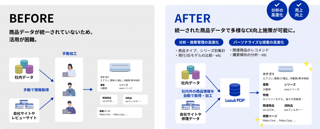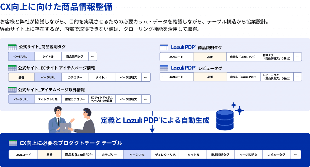 これまで、そういった商品データの収集・整備は人手を介し、手動で膨大な時間をかけて行われてきました。その膨大な工数を削減し、商品データの統合・加工・整備を実現するのが、Lazuli PDPです。