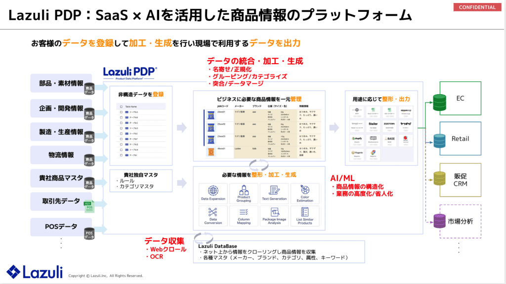 Lazuliは2020年7月に設立されたスタートアップです。高度なAI技術を駆使し、クラウドサービスとして、DXやEC、マーケティングの担当者など、ビジネスに関わる誰もが世界中の商品情報を利用できるSaaS「Lazuli PDP」の開発・提供を進めています。商品が製造、流通、販売される中で、企業間、あるいは企業内においてもスムーズに同期されていない商品データの課題の解決に努めており、製造業や小売業におけるサイロ化されたデータを統合・整備することで、DX推進を支援します。ビジネスに携わる人々が容易に商品の情報にアクセスできる世界の実現を目指します。