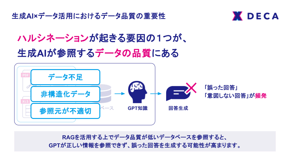 登壇者2名によるディスカッションでは、生成AIを活用するために、自社内の各部署やウェブサイトに散在するデータを構造化し、リッチ化することの重要性について話がなされました。これにより、生成AIがハルシネーションを起こさず出力をできるようになり、企業の業務効率化がより促進されます。
