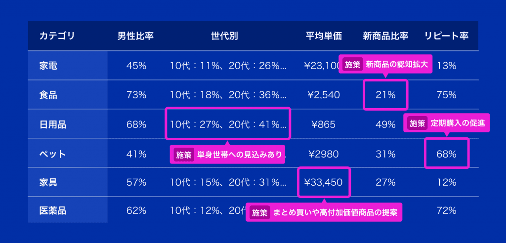 例えば、家電カテゴリの売上分析をする場合、他カテゴリと比較することで、結果が良かったのか悪かったのかの判断ができます。さらに、会員情報などを紐づけたID-POS分析であれば、カテゴリごとの性別比率や購入世代別の結果を導き出すこともできます。カテゴリが揃っていると、他カテゴリとの強み・弱みを数値化できるため、具体的な施策を打つことができます。また、カテゴリ分析には、売上以外のデータも含まれるため、顧客の嗜好や傾向を把握することで、新商品の開発や販売戦略の改善にも役立ちます。