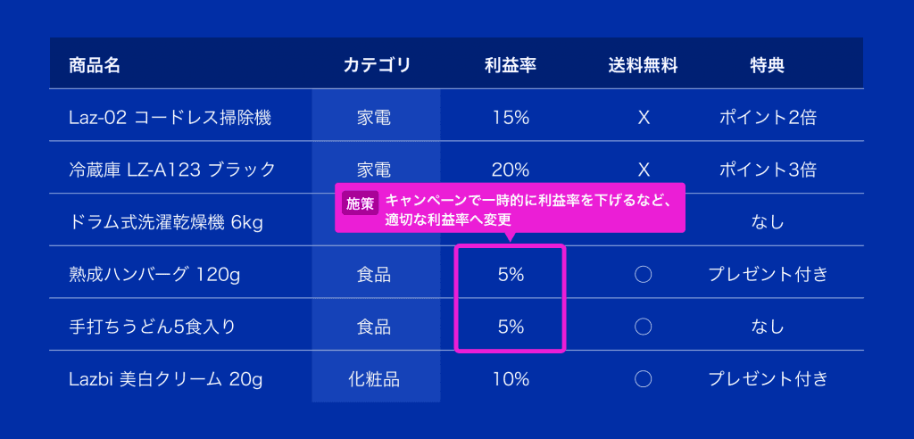 商品データのメンテナンス(価格の改定、利益率の変更、送料の変更etc)は商品単品で行うと非常に煩雑になります。しかし、カテゴリ単位で管理することで、変更・改善が容易にできるようになります。カテゴリが揃っていると、メンテナンスが効率的になり、業務工数を最小限に抑えることができます。