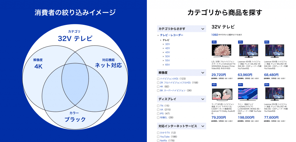 消費者が「欲しいものは決まっているが、仕様が決まっていない」といった場合に、そのカテゴリの中で絞り込みを行うことがあります。消費者が商品を絞り込む際、何を目安に探したらよいかわからない場合でも、絞り込み条件を表示することで、商品を絞り込むことが容易になり、商品到達率が向上します。