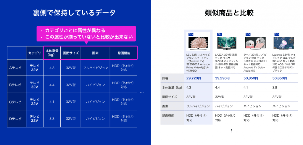 属性は商品により大きく異なるものです。例えば食品であれば原材料や素材、内容量などですが家電製品となると重量や消費電力、その中でもテレビであれば画面サイズや画質、インターネット通信機能の有無なども重要な属性に加わるでしょう。