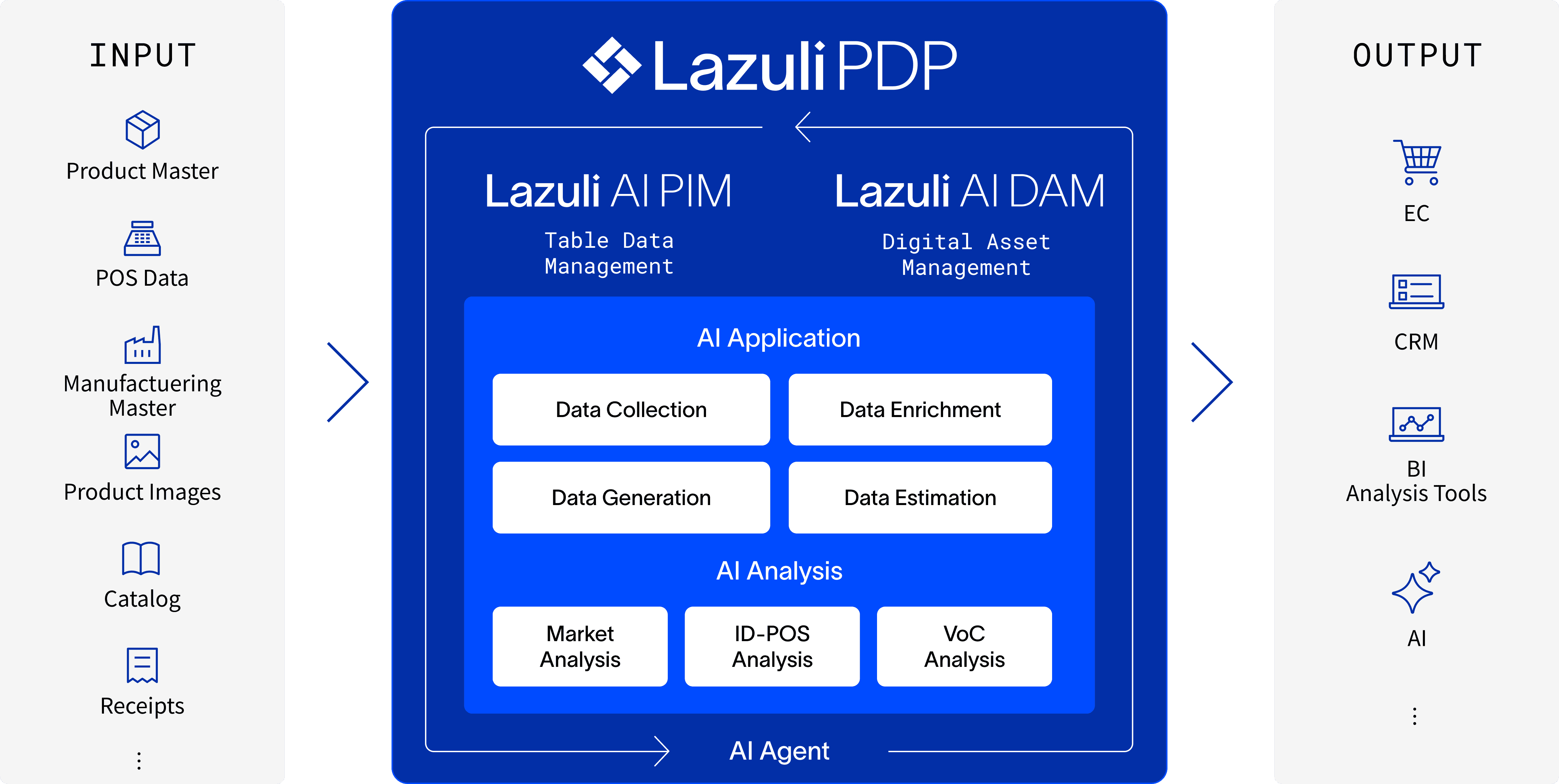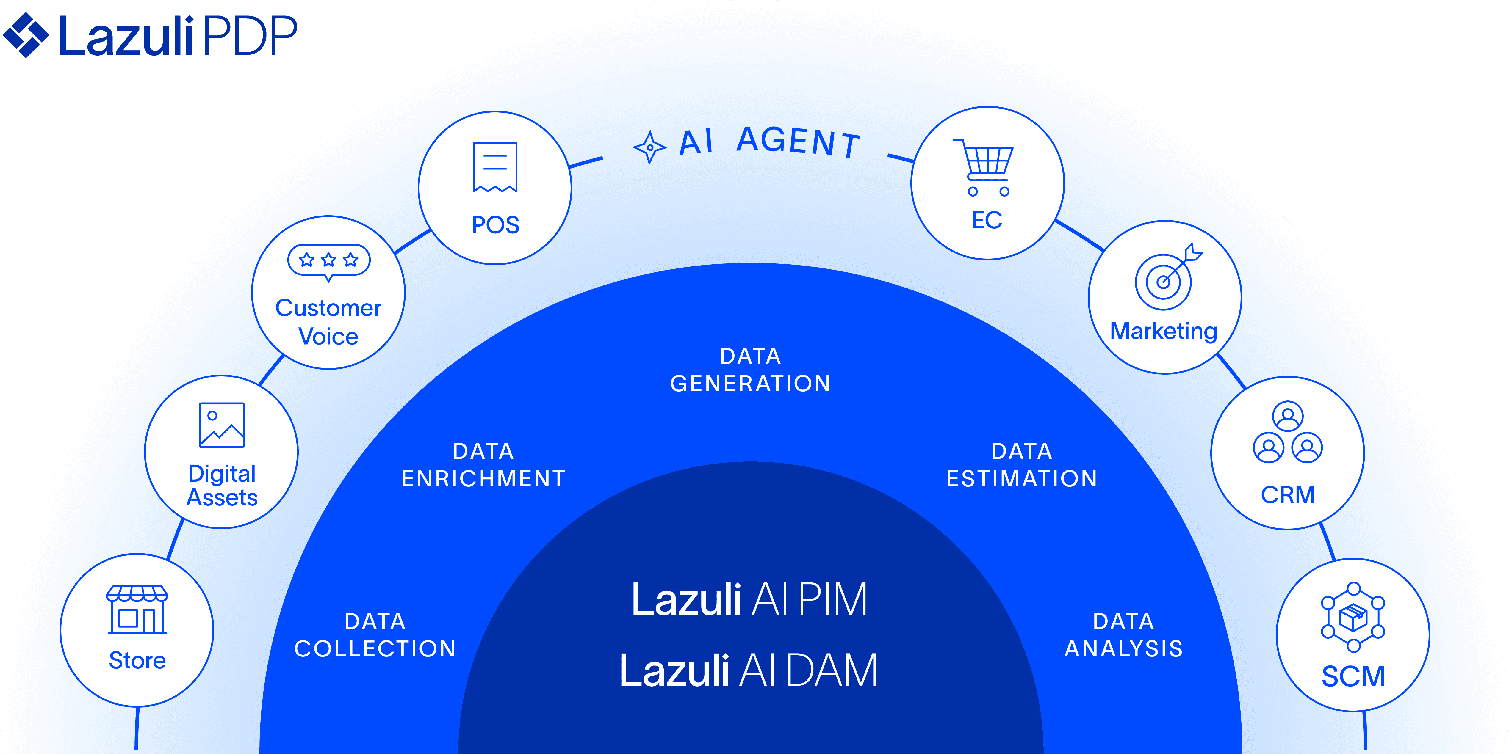 Lazuli PDP is a platform that integrates various processing functions based on AI PIM and AI DAM, which accumulate and manage product data. Furthermore, AI agents utilize these comprehensively and perform necessary processing autonomously. This provides value across a wide range of solution areas, improving the quality of product information and operational efficiency.