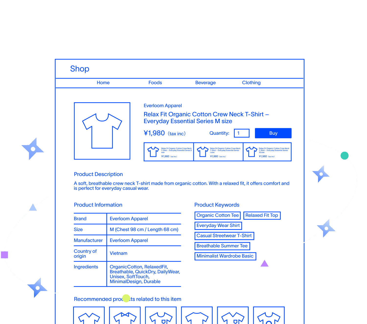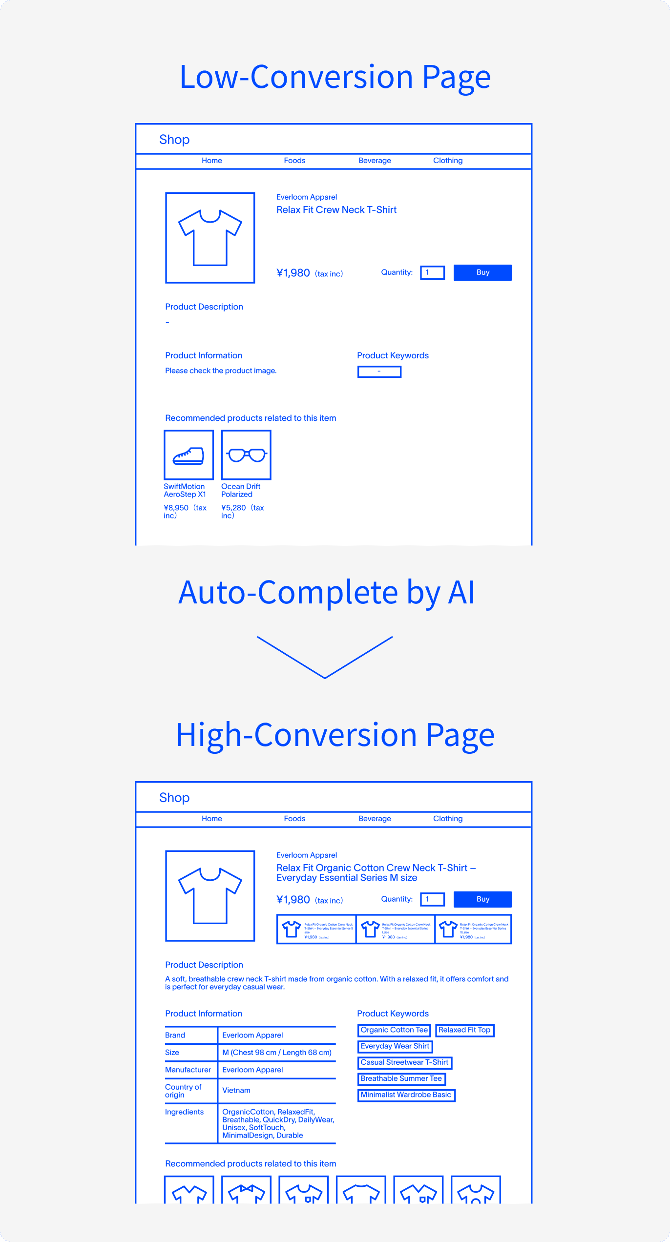 Analyze top-selling products in EC categories, visualize the gap with your own product pages, and generate strong product information reflecting improvement points.