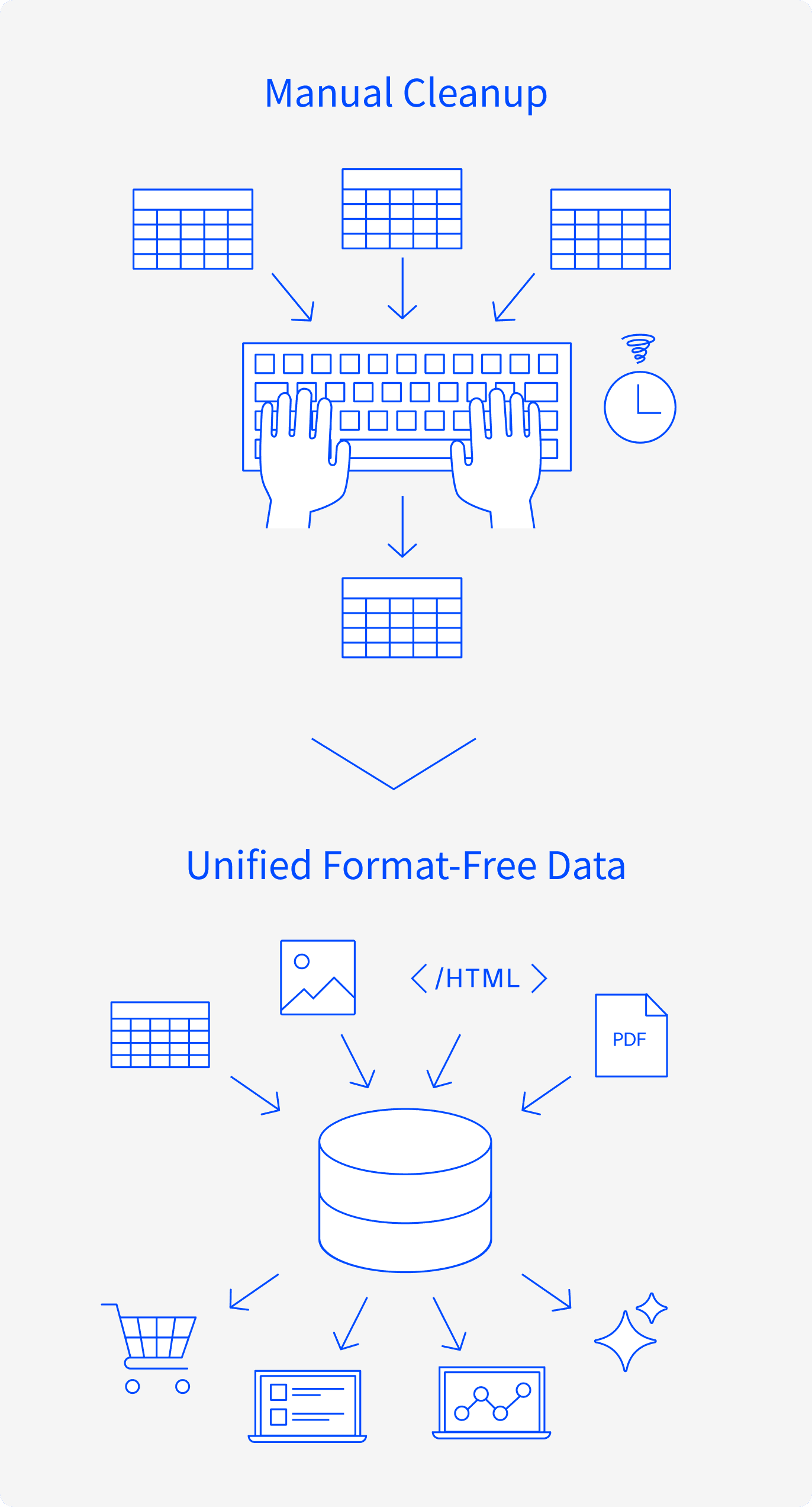 Different formats for each department, supplier, or channel increase conversion and verification tasks, slowing down overall operations. Lazuli PDP ingests data regardless of input format and supports the entire process from standardization and formatting to re-output. This allows product information to advance operations without being troubled by format differences, while maintaining consistency and reproducibility.