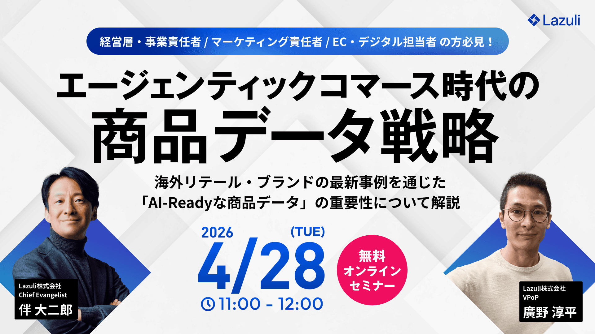 商品データの構造化・スキーママッピング・自動補完を実現するプロダクトデータプラットフォーム「Lazuli PDP」を核に、各社のデータ基盤・システムに応じたカスタム支援を提供するLazuli株式会社(本社:東京都渋谷区、代表取締役:萩原 静厳、以下Lazuli)は2026年4月28日(火)、プライベートウェビナー「エージェンティックコマース時代の、商品データ戦略」を開催します。