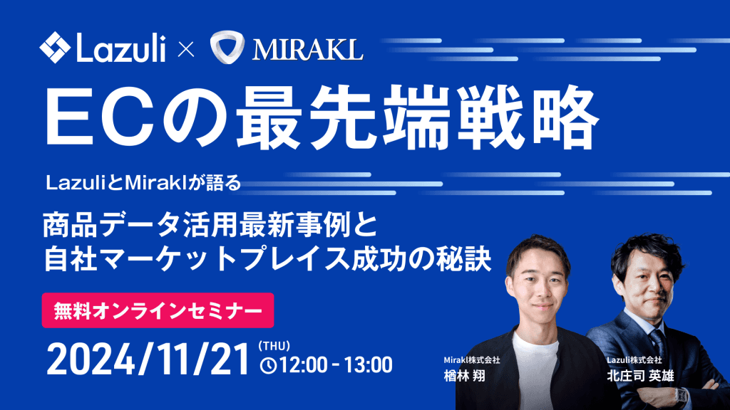 AI技術を活用した、クラウド型商品マスタ「Lazuli PDP」の開発・提供を行うLazuli株式会社(本社:東京都港区、代表取締役:萩原 静厳、以下Lazuli)は、Mirakl株式会社(本社:東京都港区、代表取締役社長:佐藤 恭平)と共催で、11月21日「ECの最先端戦略〜LazuliとMiraklが語る商品データ活用最新事例と自社マーケットプレイス成功の秘訣〜」と題したオンラインセミナーを実施します。