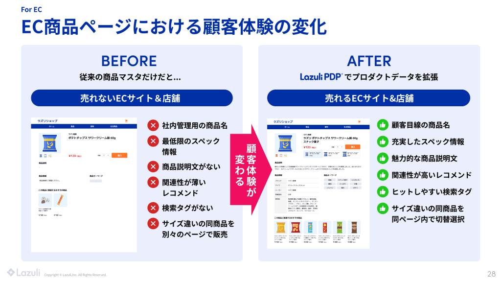 Lazuli株式会社(本社:東京都港区、代表取締役:萩原 静厳、以下Lazuli)が開発・提供する、AI技術を活用したSaaSのクラウド型商品マスタ「Lazuli PDP」が、株式会社ビックカメラ(本社:東京都豊島区、代表取締役社長 秋保 徹、以下ビックカメラ)が運営するビックカメラのインターネット総合通販サイト「ビックカメラ・ドットコム」に、2024年9月より商品情報を拡充、整理するためのAIソリューションとして採用されました。