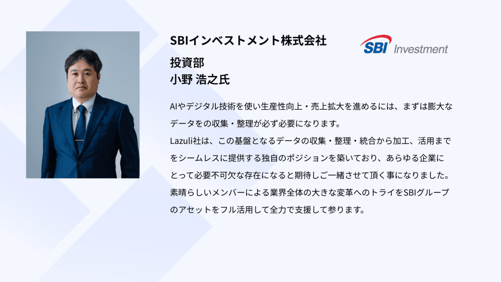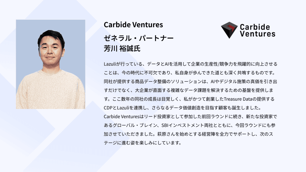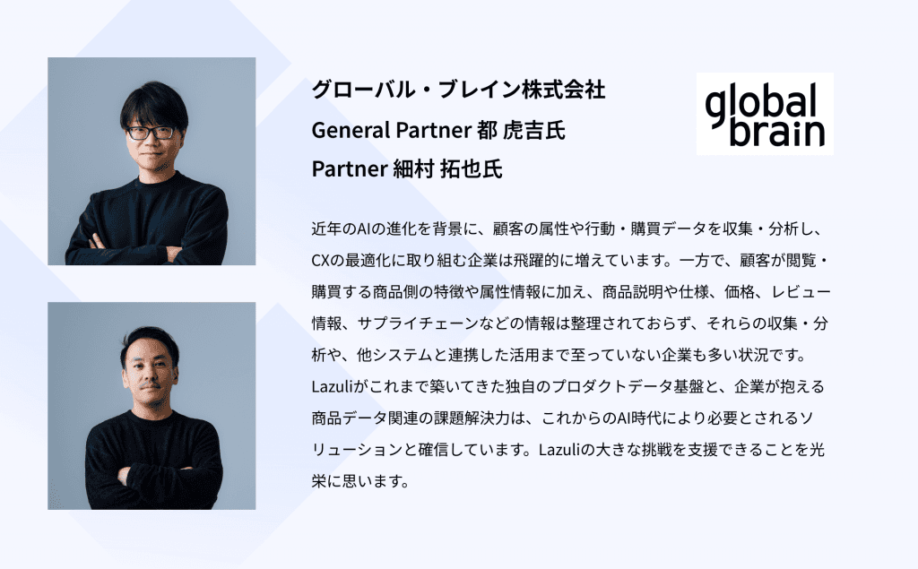 AI技術を活用し商品データ整備を行う「Lazuli PDP(Product Data Platform)」の開発及びソリューション提供を行うLazuli株式会社(本社:東京都港区、代表取締役:萩原 静厳、以下Lazuli)は、2024年12月、グローバル・ブレイン株式会社をリードインベスターとして、SBIインベストメント株式会社、Carbide Ventures、を引受先とするシリーズBラウンドの第三者割当増資に関する契約を締結しました。本ラウンドの調達額は総額10億円で、これにより、Lazuliの累計調達額は、15億6000万円になります。