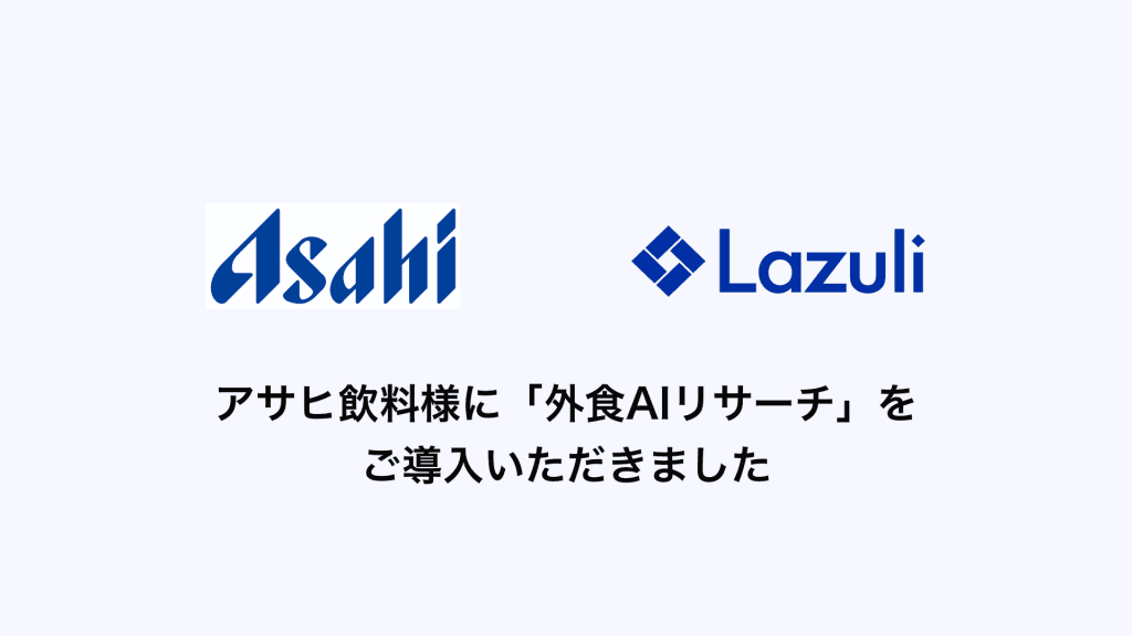 Lazuli株式会社(本社:東京都港区、代表取締役:萩原 静厳、以下Lazuli)が開発・提供するサービス「外食AIリサーチ」が、2024年10月よりアサヒ飲料株式会社(本社:東京都墨田区、代表取締役社長:米女太一、以下、アサヒ飲料)に導入されることが決定しました。