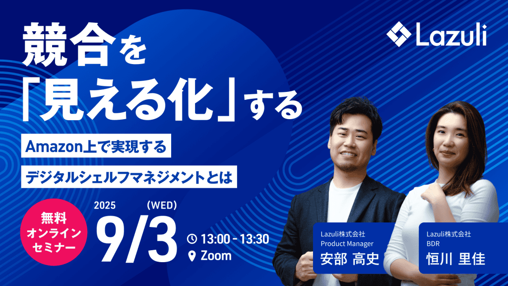 AI技術を活用した、クラウド型商品データ整備ソリューション「Lazuli PDP」の開発・提供を行うLazuli株式会社(本社:東京都渋谷区、代表取締役:萩原 静厳、以下Lazuli)は、2025年9月3日(水)、「競合を『見える化』する Amazon上で実現するデジタルシェルフマネジメントとは」と題したウェビナーを実施します。