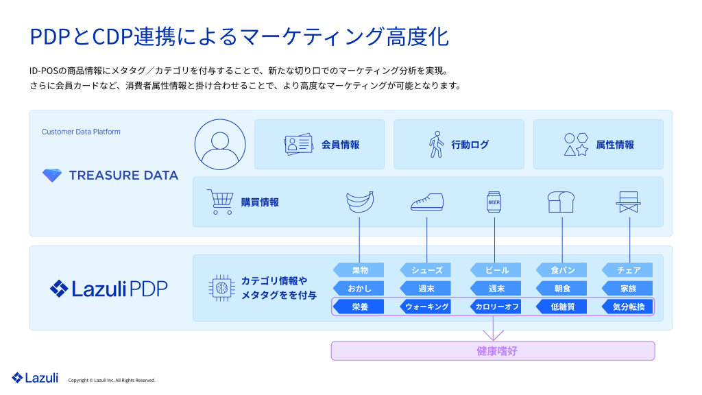 「Treasure Data CDP」は、顧客データを統合し最適な体験設計・体験提供を可能にする基盤、「Lazuli PDP」は、AIを活用して商品データを正規化・整備する基盤、であり、両者の連携によって企業は「商品」と「顧客」を結びつけた新たな価値創出を実現できます。