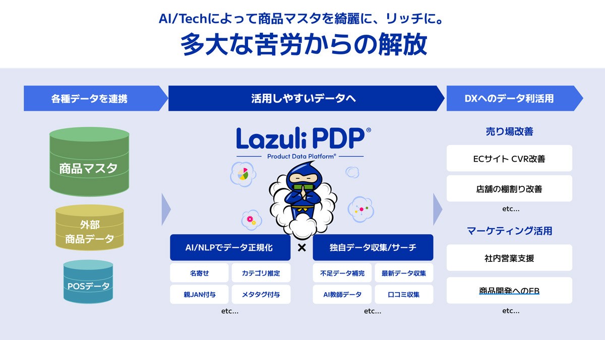 Lazuliが開発、提供する「Lazuli PDP」は、複数の外部データベースに点在していた商品情報を一括して管理し、またデータを活用しやすい形に整理、拡張するためのクラウドサービスです。メーカーや小売業者、製薬業者などが保有する多様な商品マスタデータを、AIを活用して名寄せし、製品の特徴からメタタグの付与や関連付けを行います。これらの情報が「Lazuli PDP」を通じて、ユーザーに提供されます。